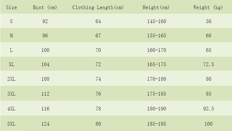 5XL | 124 / 48.82 | 80 / 31.50 | 185-195 / 72.83-76.77 |